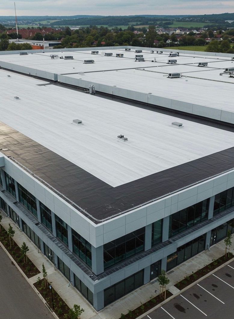 Low-slope membrane systems designed for positive drainage, ponding-water resistance, and seamless waterproofing across large commercial roof areas.